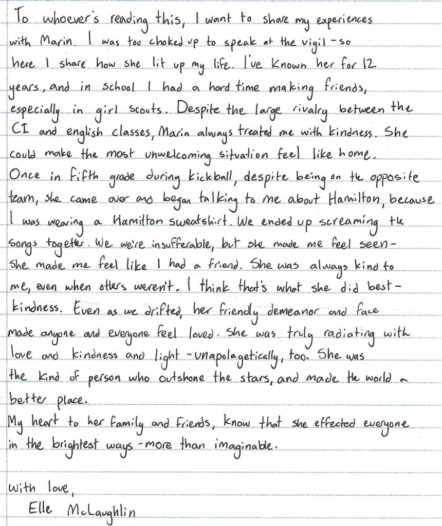 The first time I met Marin was on my driveway. She helped load frozen meat products in the Community Meal freezer. Gentleness comes to my mind when I think of her. Of course she was polite, respectful, kind and willing to do any tasks assigned. What a privilege to have had such a remarkable daughter, sister, friend and person whose light shined on all of us.