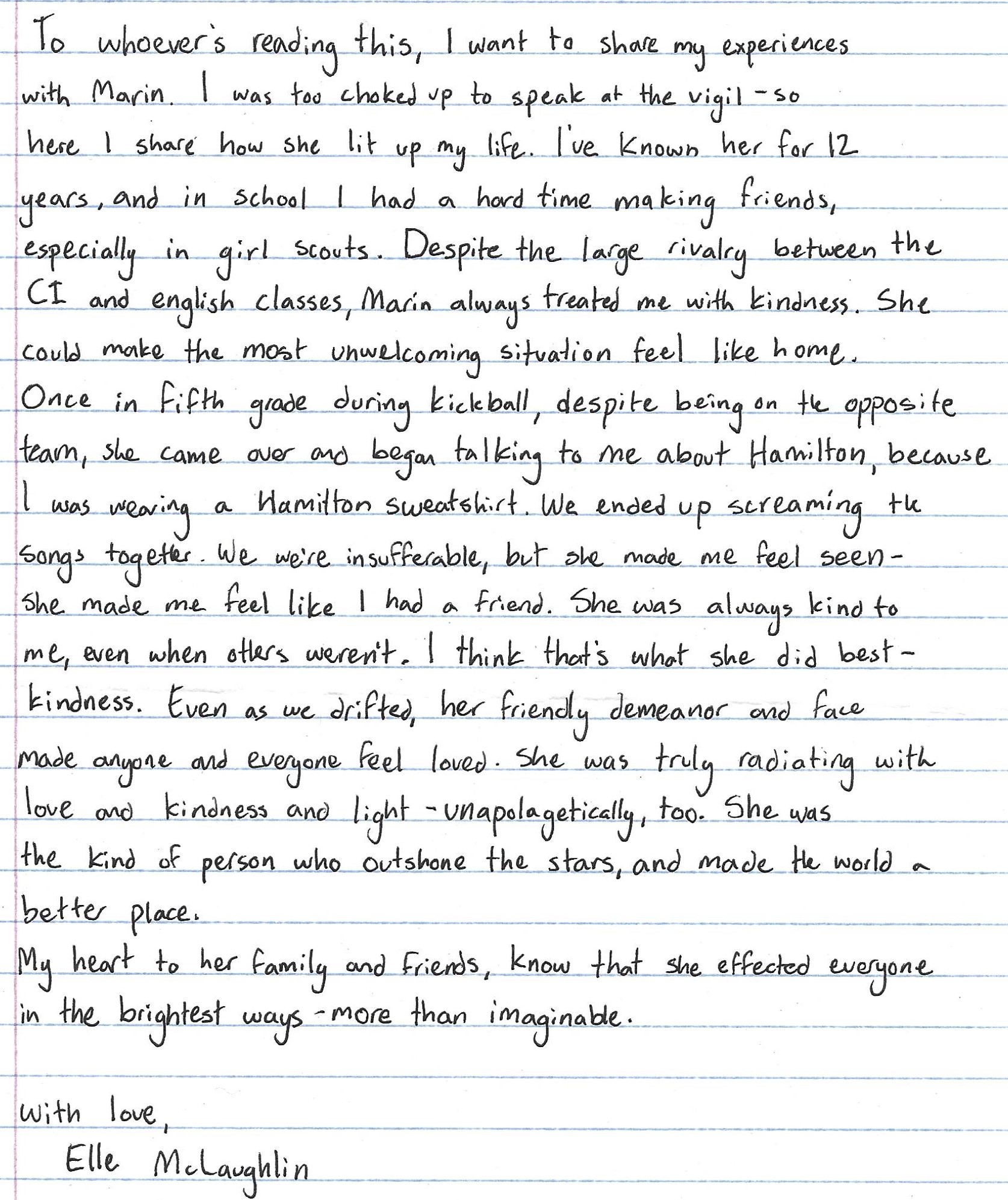 Marin was a multi-faceted person who embraced life with enthusiasm. Born on October 22, 2006, her vibrant spirit shone brightly from the beginning until her unexpected passing in a tragic accident on January 25, 2024, at the age of 17. She is survived by her loving family: her parents, Bridget and Mike, and her brother Nick.