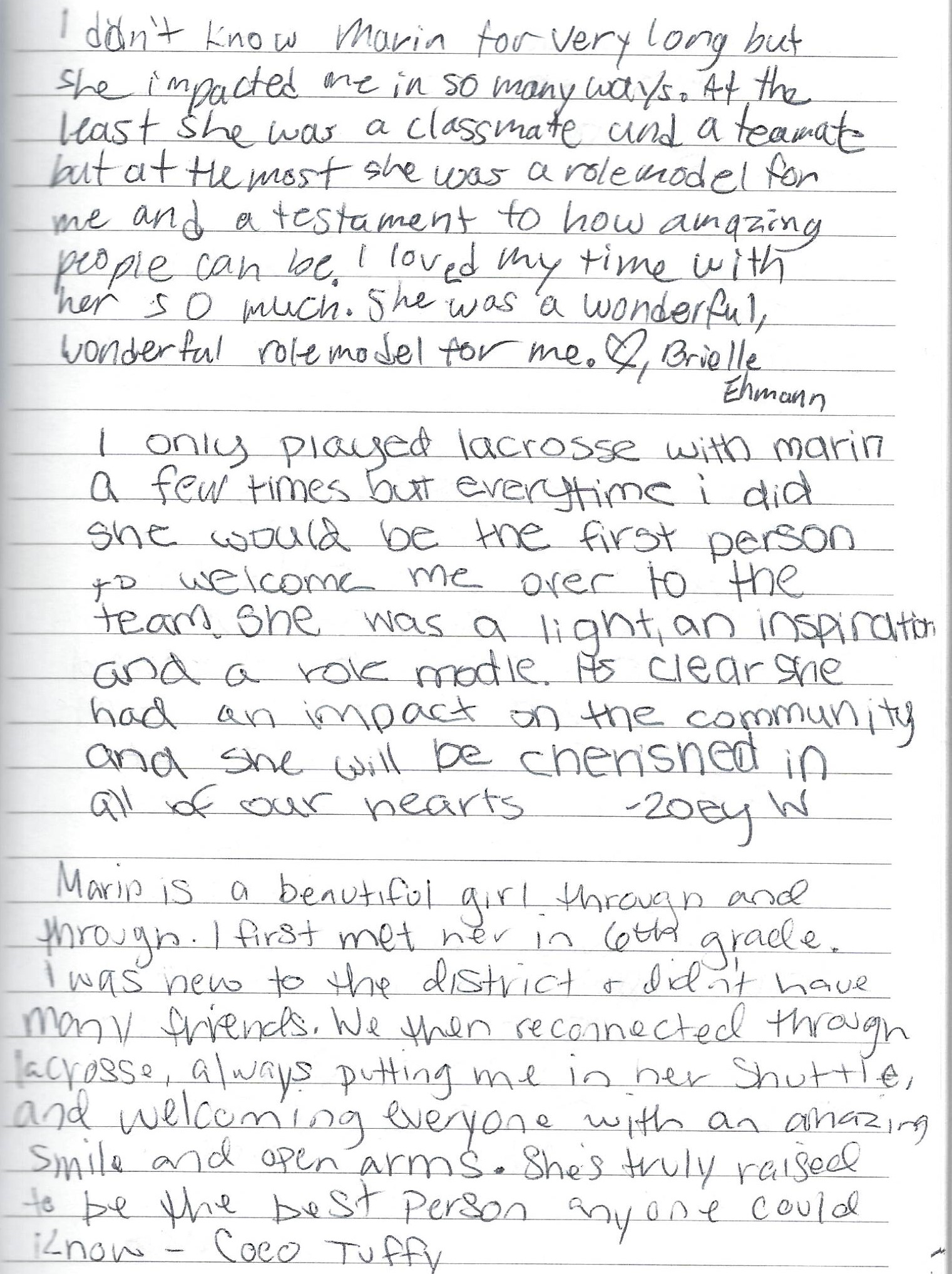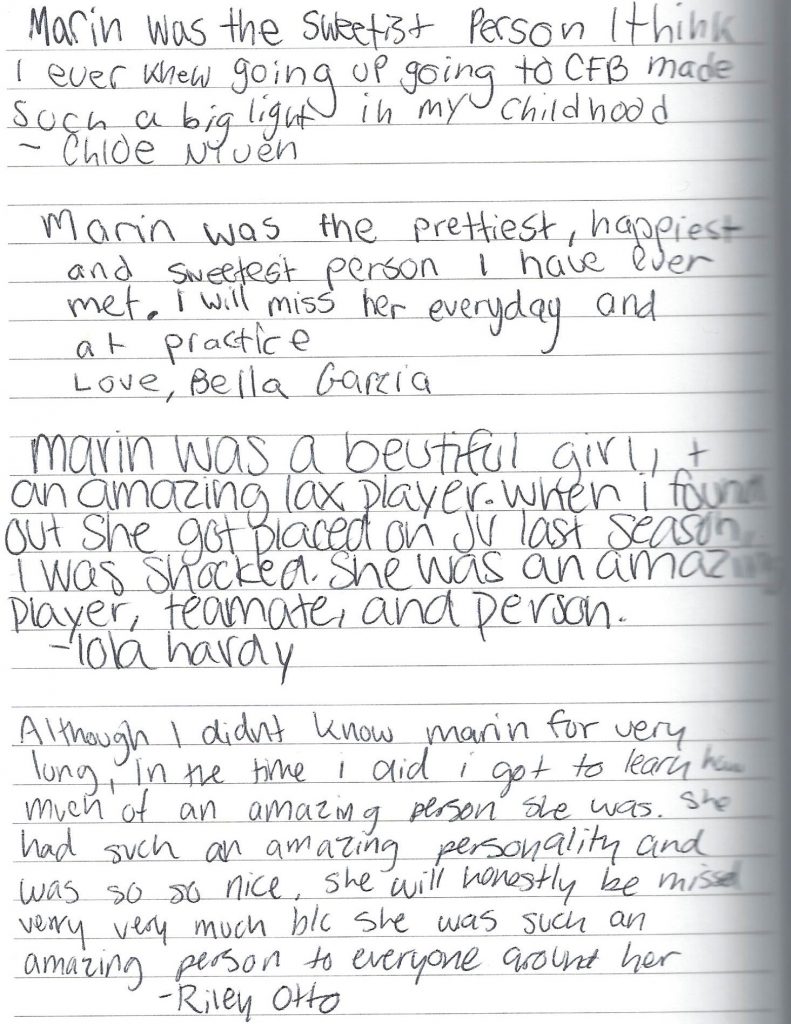 On the first anniversary of Marin’s passing, we asked everyone who ever had any opportunity to meet Marin to share their stories with us. Thank you for allowing us to share it with others. How did you know Marin: Middle School Classmate/Friend When I met Marin in middle school, you could instantly tell she was…