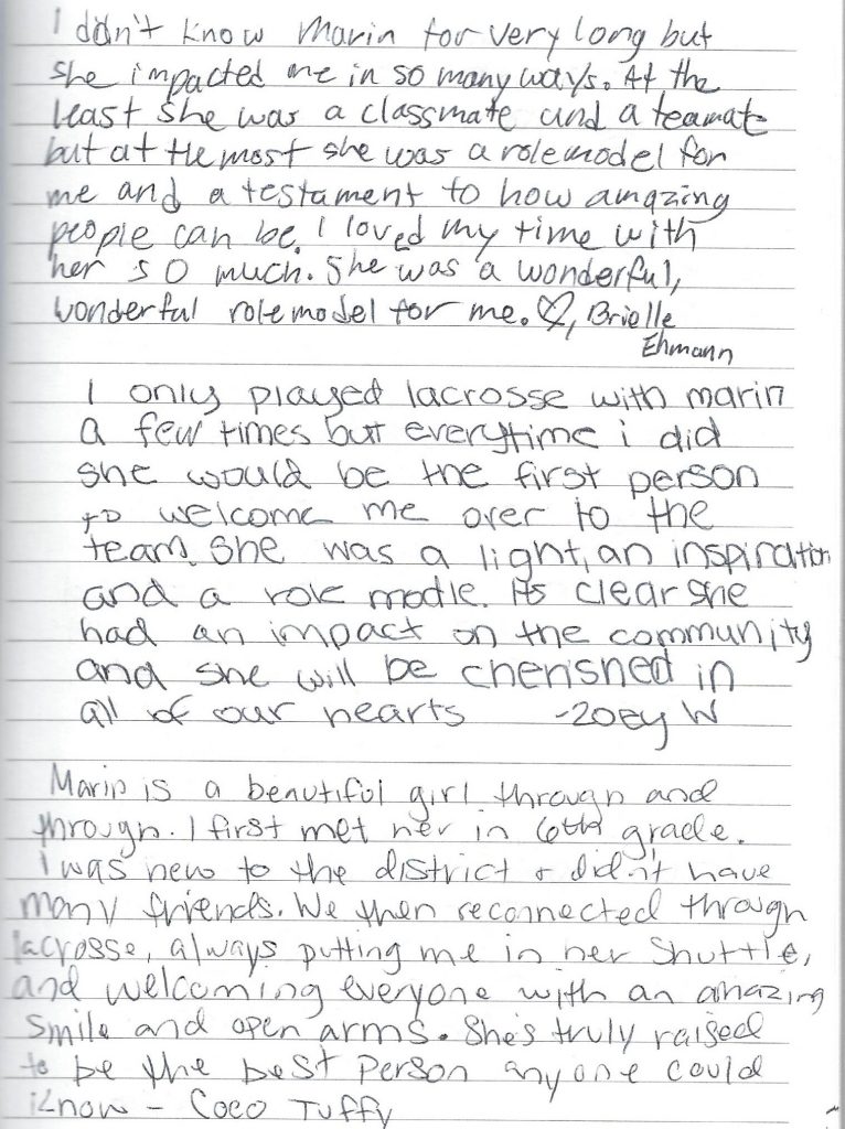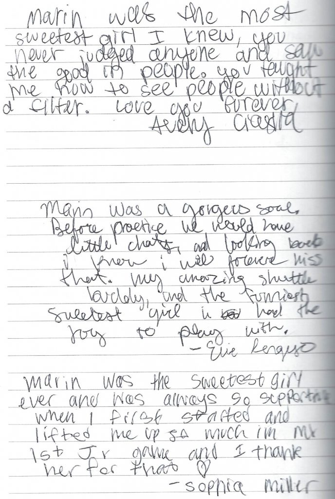 Thank you for allowing us to share in the life of Marin. She made all of our lives better and she will always be remembered as a kind and loving person, an example of how we all should treat other people.