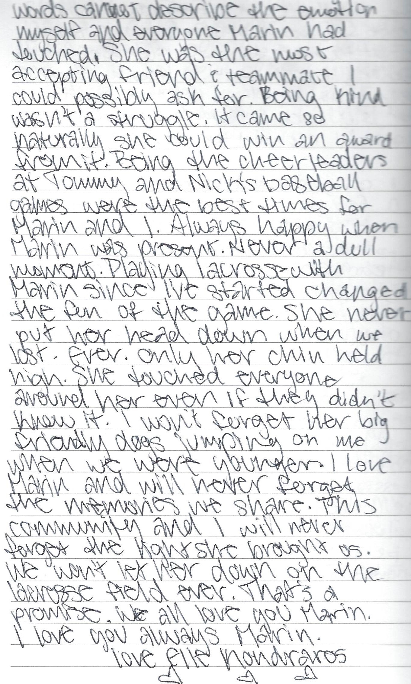 Marin’s older brother Nick and I went to elementary together and I knew Marin through my lunch hour during my senior year. Marin never failed to make me smile and was the sweetest brightest girl anyone could know… I’ll never forget seeing her bright smile each and every day.